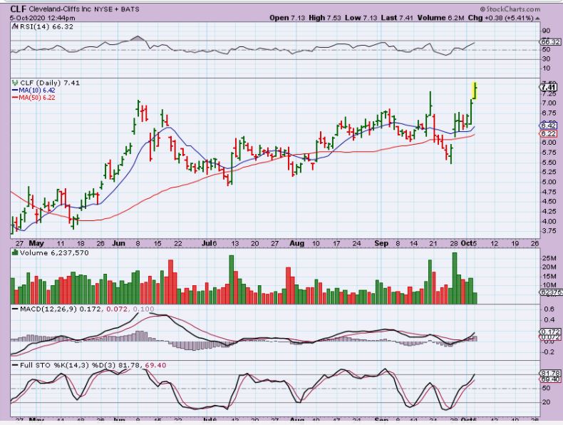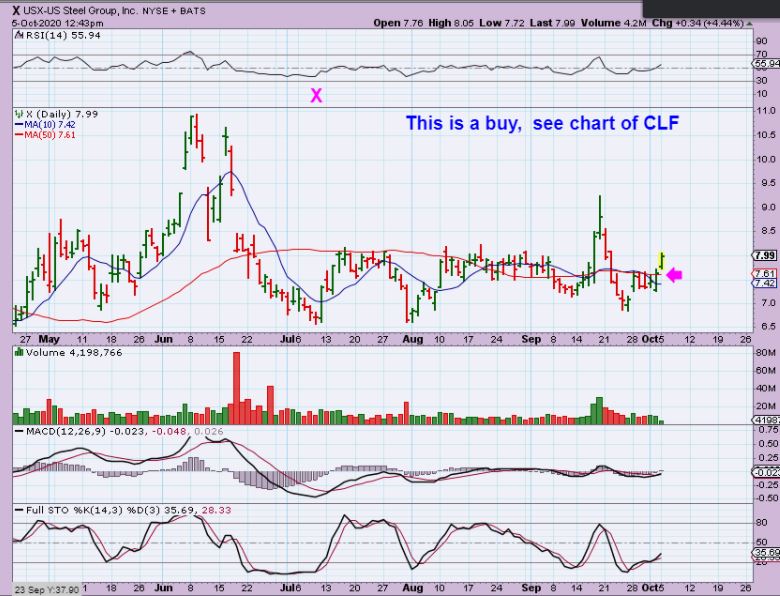 X  is a steel stock that Popped from a consolidation & above the 50 sma.  I mentioned it in the live trading area and said that it looks to be catching up to what CLF has done, so lets look at CLF  (this is a buy) ..