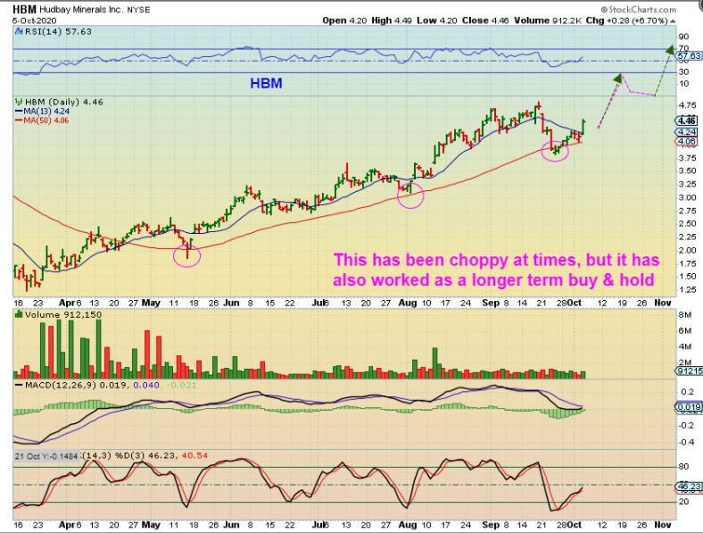 COPPER STOCKS have been mentioned in past reports as trending ( Choppily) Higher.   Charts of HBM, TGB, and FCX look very very similar right now.  They dropped to the 50 sma to oversold conditions & have reversed as a buy.