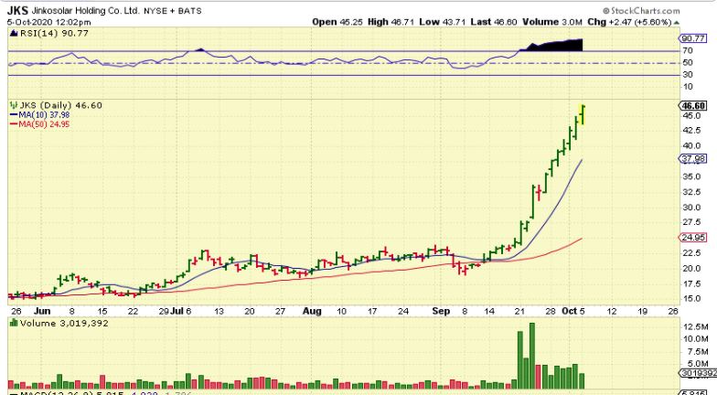 JKS :  This chart certainly does NOT help me to know when to sell the strong runs in Solars.   SPWR or CSIQ.   As you can see, JKS, VSLR and RUN have been having an amazing straight up  run.  All you can do here is either scalp some gains on the way up, Sell some & let the rest run, or use a trailing stop ( 8 ema? 9 or 10 sma? 13 sma? etc) to catch the upside and hope that we don’t get a gap down one day.