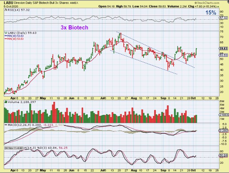 LABU – So with Bullish markets we discussed trades long such as TQQQ, SOXL, SPXU. Well Biotech is bullish too, and LABU was up 15% Monday. This sector may be more bullish with the recent increase in Covid cases.