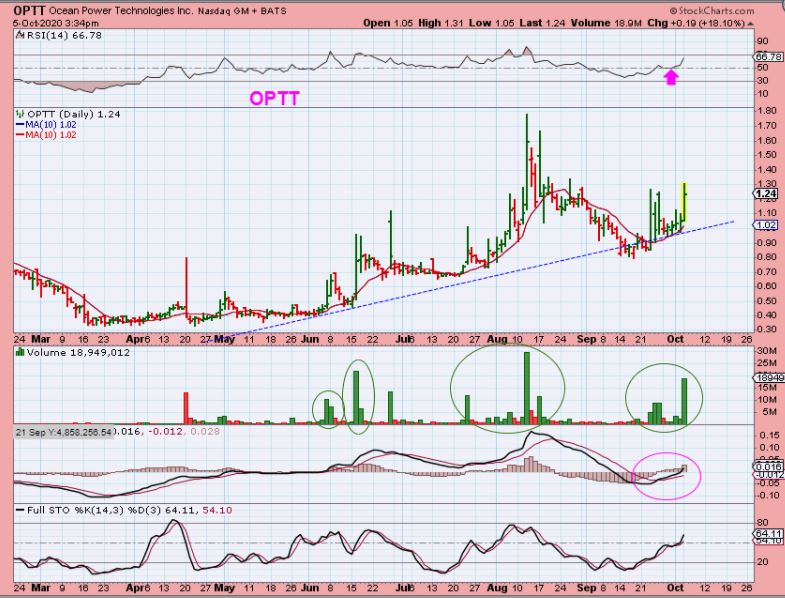 ** OPTT – I Bought this yesterday when I saw this set up. It has high surges of volume, is trending higher and looks like a decent ‘Swing Trade’. What I also liked about OPTT is…