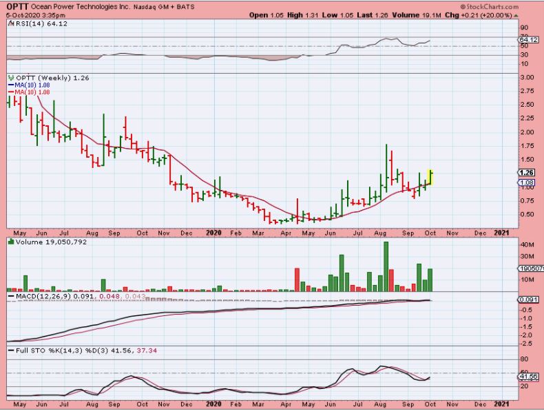 I REALLY LIKED THIS OPTT WEEKLY CHART– This has just moved higher above the 10 week MA and the upside potential looks very good for a swing trade.  Low risk / High reward.