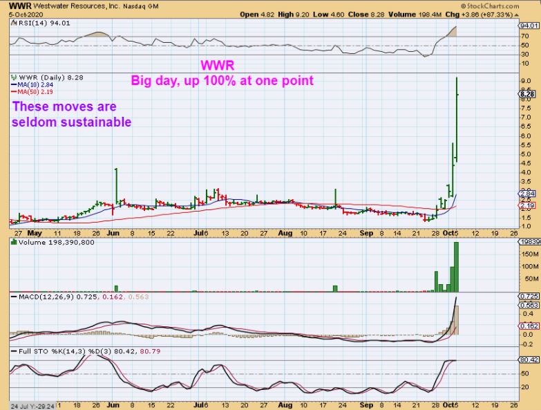 6 a.m. EDIT:  WWR was bought when it was around $1.35.    It hit  $9 yesterday and actually hit $17 IN PRE-MARKET When I woke up this morning!!!  The Robin hood crowd no doubt.  WWR is now dropping again in premarket .  I have been trading this one on the way higher, but I am down to half of my original position now.  These kinds of moves are not sustainable, so I sell some on the way higher using intraday charts and trade it or just let some ride with trailing mental stops too.
