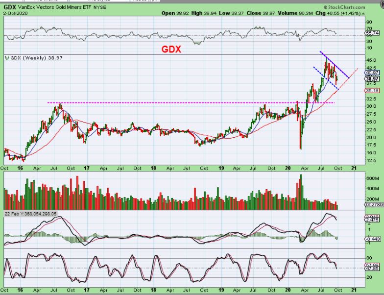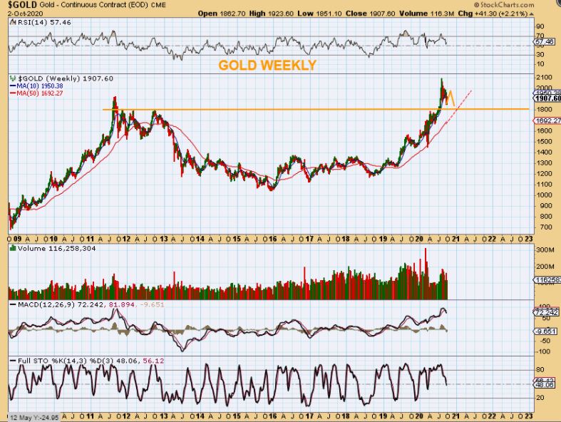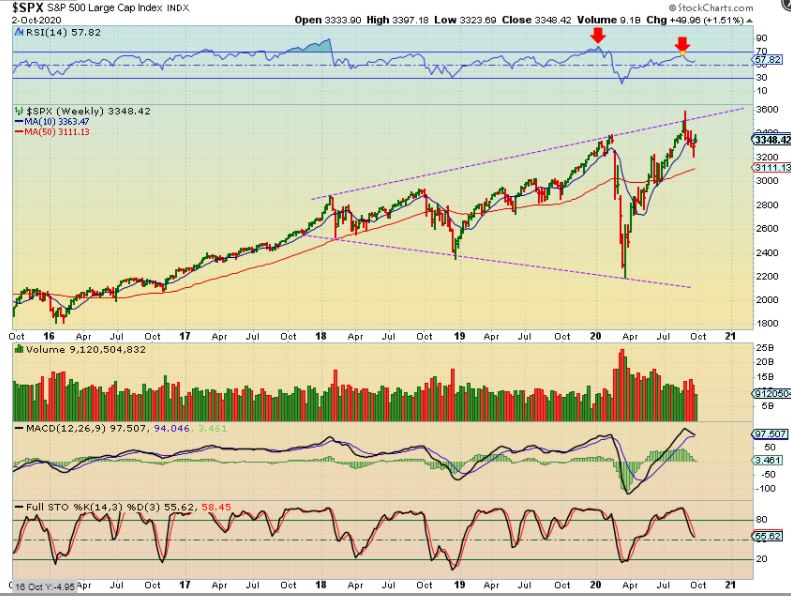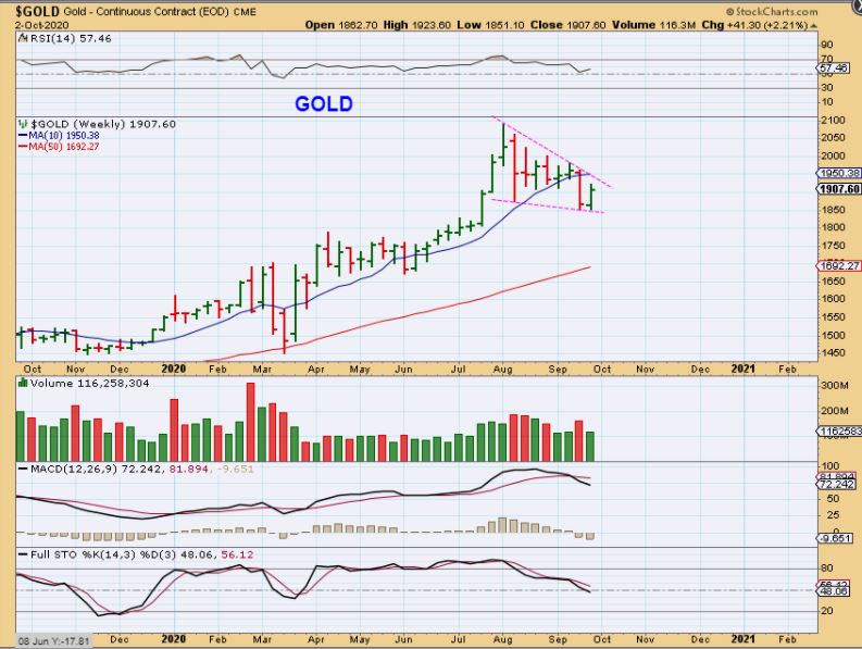 Change? A second wave of the spread of the Corona virus ( at least in the US) has been predicted with schools & restaurants now fully opening up, Country & state restrictions are relaxing, and people are gathering at an increasing rate indoors when the cooler weather comes into play.  We have also now seen the President of the US , his wife, and many White House members becoming infected with the Covid Virus. This change can affect market psychology if the health of a major countries leader was to take a turn for the worse.  And don’t forget that the US elections are only 1 month away!  What if President Trump is in the hospital during the final month of campaigning & election?   Changes such as that could cause uncertainty and lead us into a very choppy month ahead.    As for this weekend report?  Not a whole lot has changed so far, but we should try to be ready if we see things start to change next week.  No let’s take a look at last weeks action.