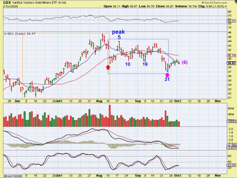 GDX DAILY-I want you to notice this Sept 21st chart.  I realized that the choppiness could stop at anytime as we appraoched day 30 and then  just drop us into a dcl around day 33.