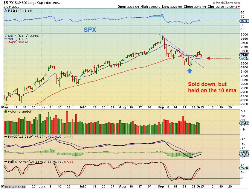 SPX DAILY – The SPX & NASDAQ moved over the 10 sma, confirming that a dcl is in place.  It is day 6 for the SPX.  Trumps covid news release Friday Might have dropped the markets, but they held up above the 10 sma and a good number of stocks remained bullish too.  So far we only have a small change here.