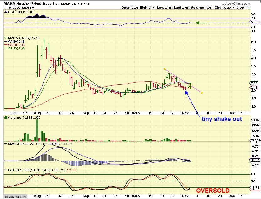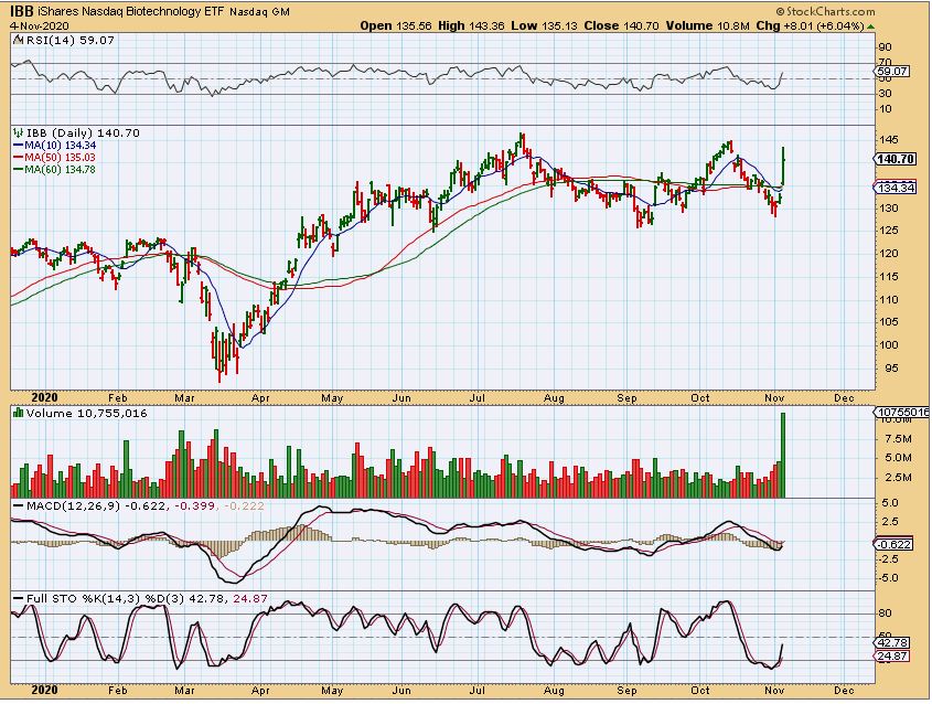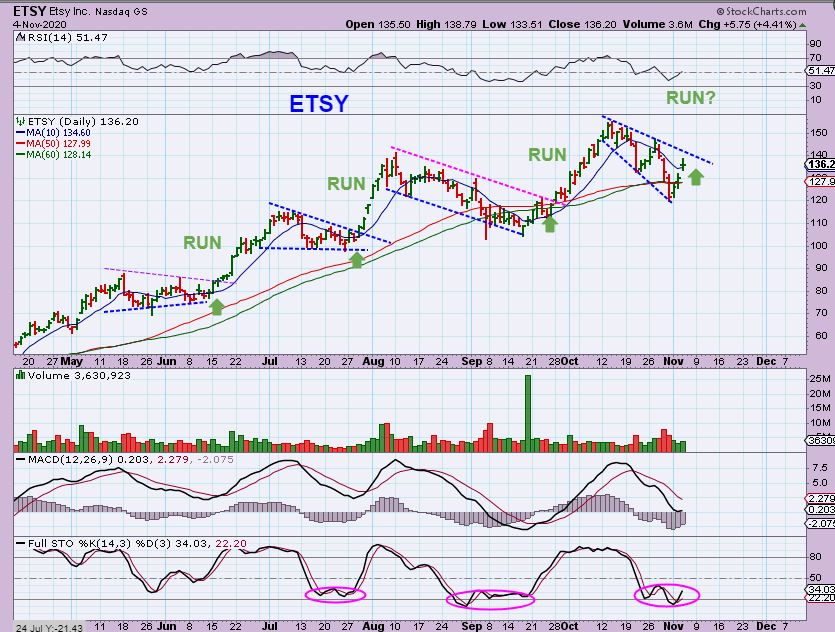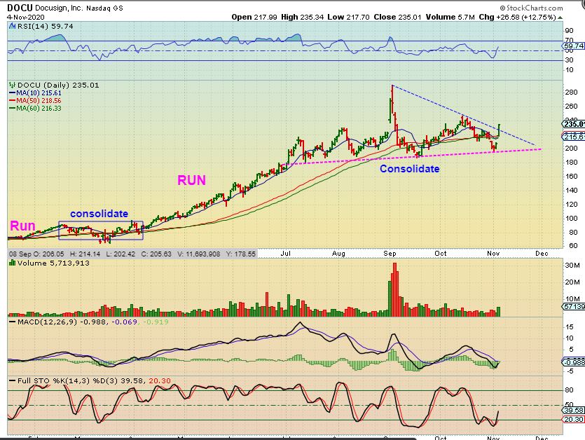 It had been hinted at by many that the markets would Crash if  Trump lost the election, but what we really might see is simply ‘Sector Rotation’.  If Biden were to win, his goals have been linked to Clean Energy , legalizing Medical & Recreation Marijuana nation-wide, working on health care, and favoring relations with China. Those Medical Marijuana stocks are set up in a way (Bases) that they could really take off higher and now Biotechs popped, Chinese Companies have been setting up and running, Clean Energy and EV (electric Vehicles) are bullish too, so overall the general markets still look bullish after a choppy consolidation, despite any election result fighting.  WATCH THE ABOVE SECTORS TODAY FOR CLUES.