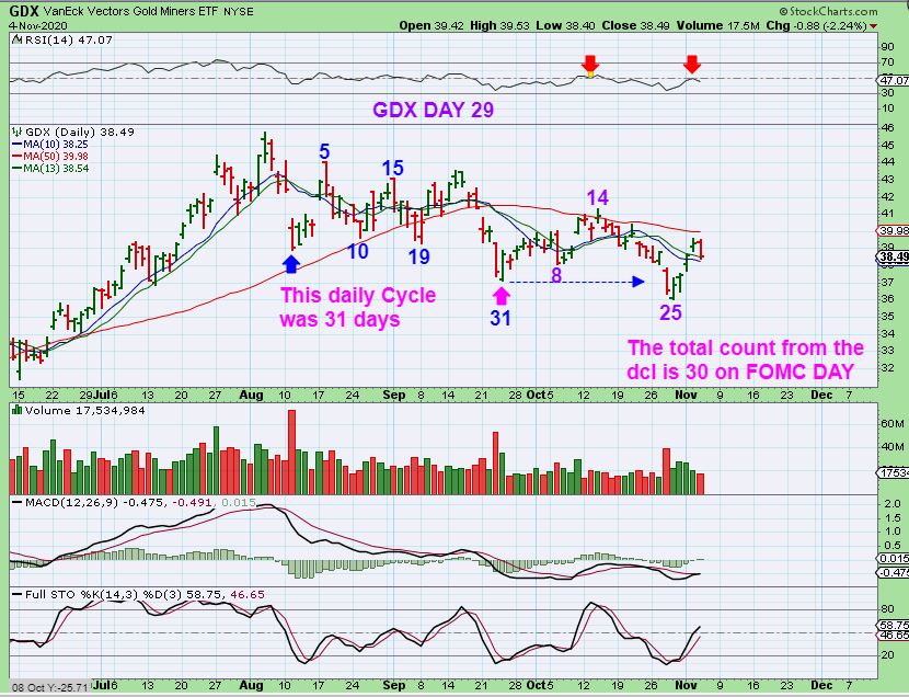 GDX – This would be day 29 if day 25 is not an early dcl.  If it was an early dcl/ICL, this is only day 4.  These cycles often run 33 days on average, so one more spike down is possible.  I have explained this 1000 times, so we already know that yesterdays drop is normal. Read the chart.