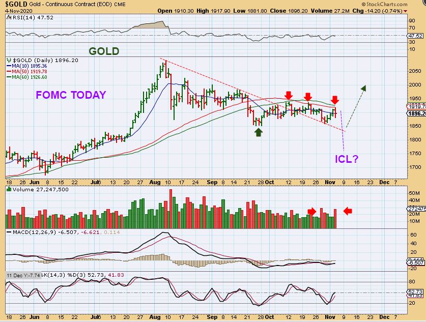 GOLD may already have that mild ICL in place that I mentioned when it broke the down trend line & back tested it. Today is the FOMC day that we have been waiting for to get out of the way.  It is a day of indecision for this sector, and then we should get the DROP or POP . Either one should eventually lead to this sector rallying for 3 + Months.