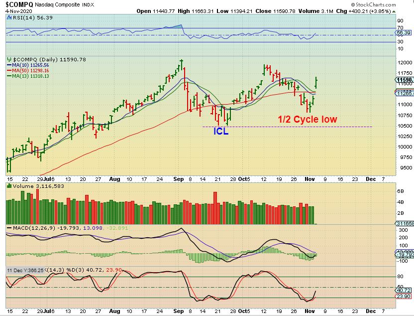 The General Markets here represented by the NASDAQ certainly had some bullish follow through as it broke back above the 50sma with conviction. It would still appear that the call of an ICL in September and a deep emotional 1/2 cycle low took place in the sell off heading into the Election week.