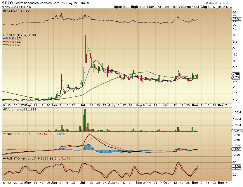 SOLO  is an EV Stock that I posted as a buy over the past week. It is still looking healthy and should have further to go. The EV (Electric Vehicle stocks) have done well under the Trump administration and also would do well under Bidens clean air administration.
