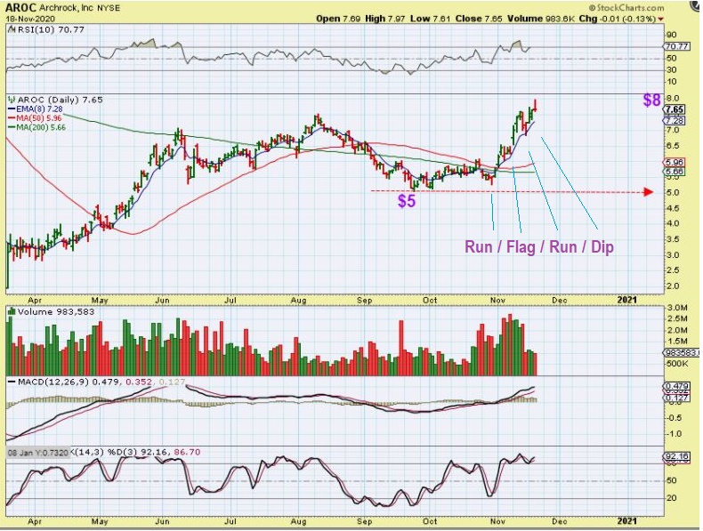 Take a look at AROC : This ran, flagged , Ran again, etc. The 8 ema has held price along the way. Many stocks did this kind of a run up the 8 ema or 10sma.