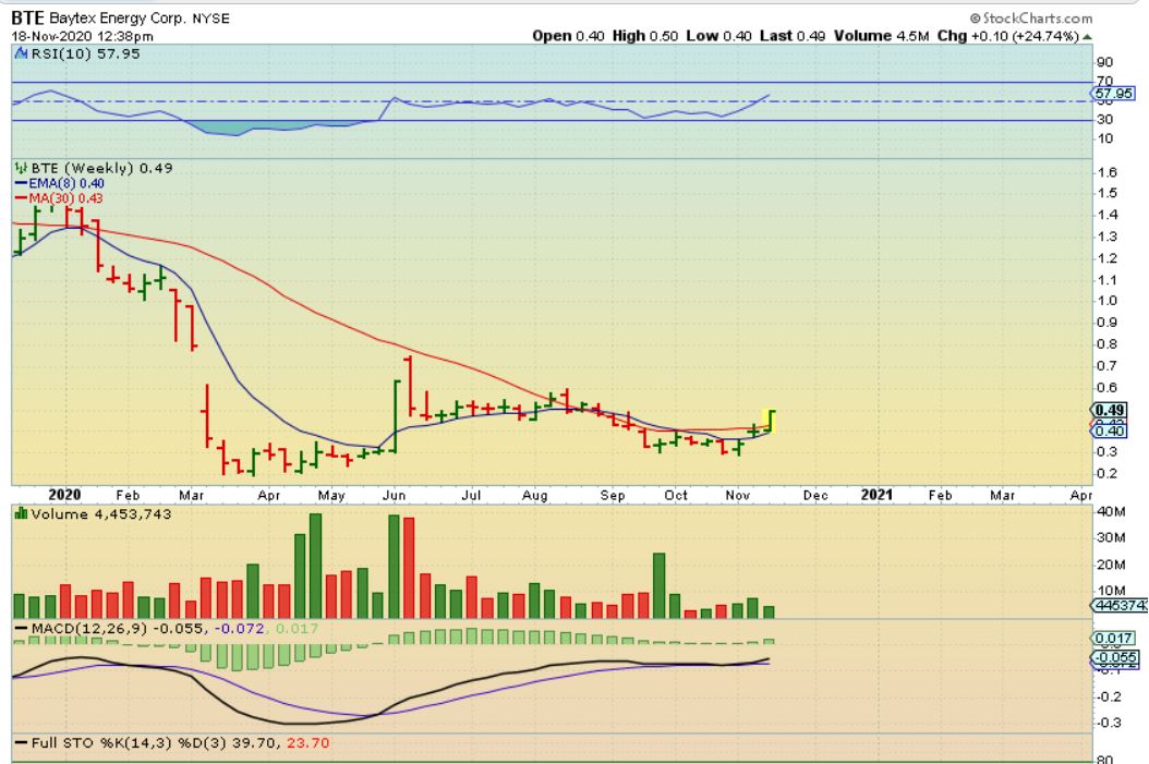 BTE WEEKLY – Then when I look at the weekly charts I can see that many of these have formed a higher low base and are breaking higher.