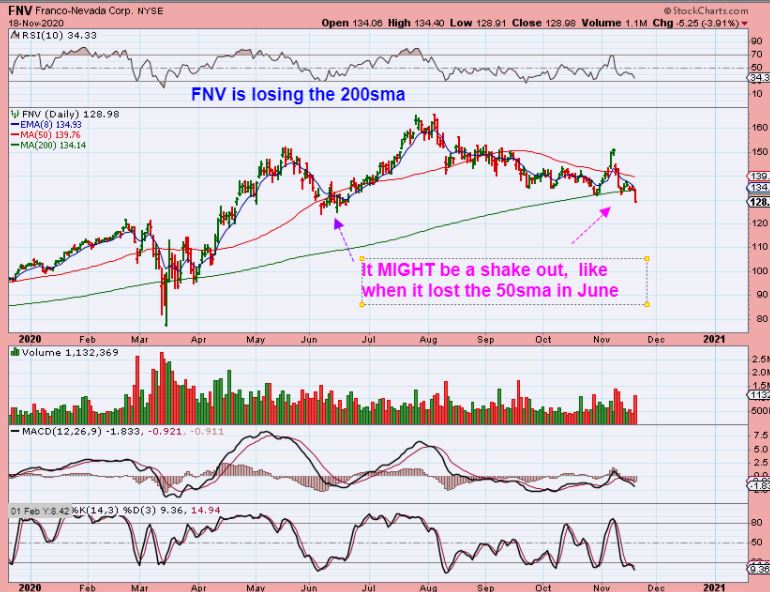 FNV lost the 200sma and that is concerning, but it also could be a shake out. Only time will tell, and to be safe I would be stopped out if I owned FNV, but you can look at June 2020 to see what a shake out might look like.