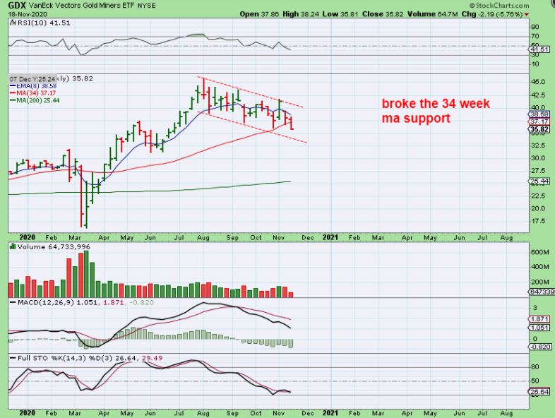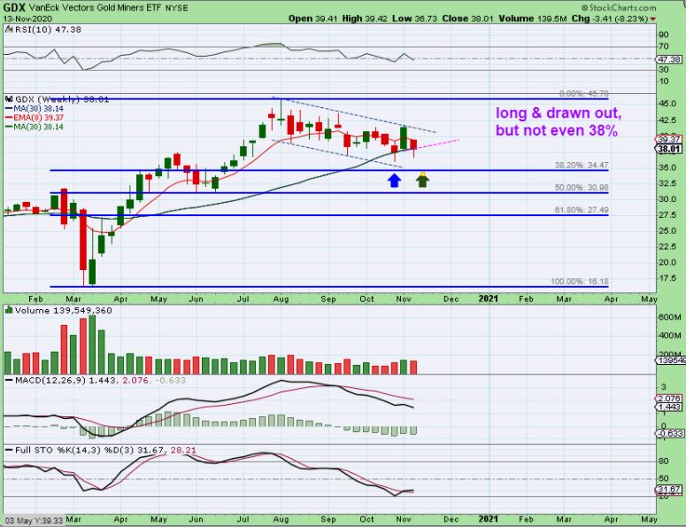 GDX WEEKLY – If the channel from prior dcls holds, the dip will be over soon.