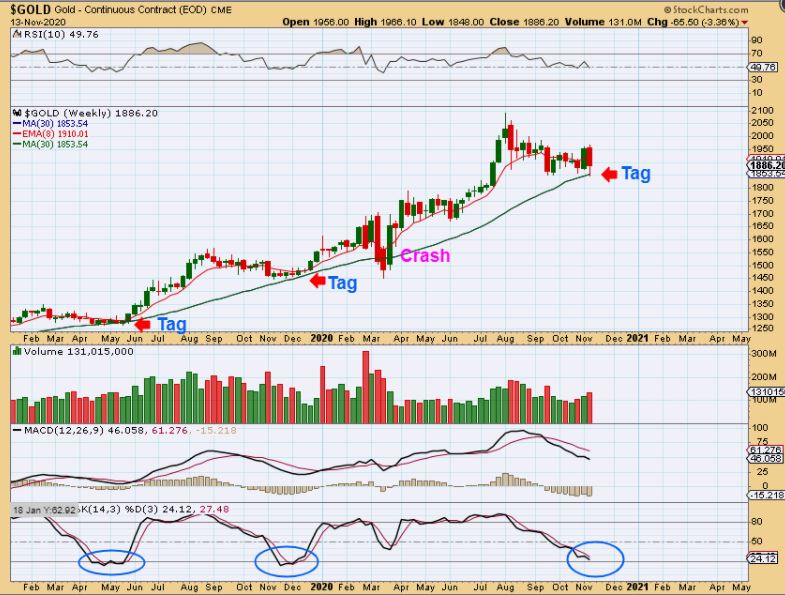 FROM THE WEEKEND REPORT : GOLD – We finally tagged the 30 week ma this week! That is good news. This is actually something that I have been pointing out as a plausible target for months, so even with the frustrating choppy sideways move, we are now seeing expectations play out bullishly. We MUST be close to the real break out. We also reached oversold, another thing that I have pointed out over time. (EDIT: It looks like we may tag it again or slightly break below it if Gold sells off).