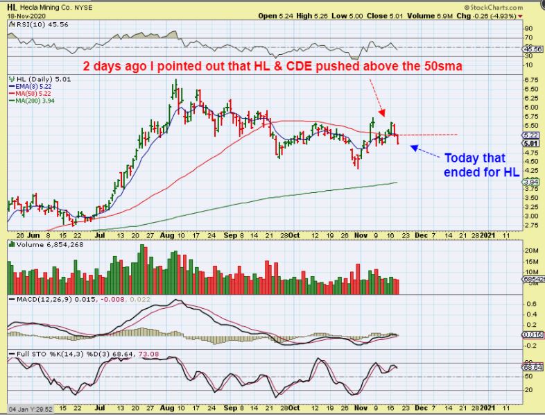 HL – On Monday I pointed out that CDE & HL were moving off of the 50sma and that was encouraging, though other Silver stocks remained below theirs. Now HL lost the 50sma and that might have stopped some out. I could see how this could drop to the 200sma IF Silver drops to $20. That is a big drop.