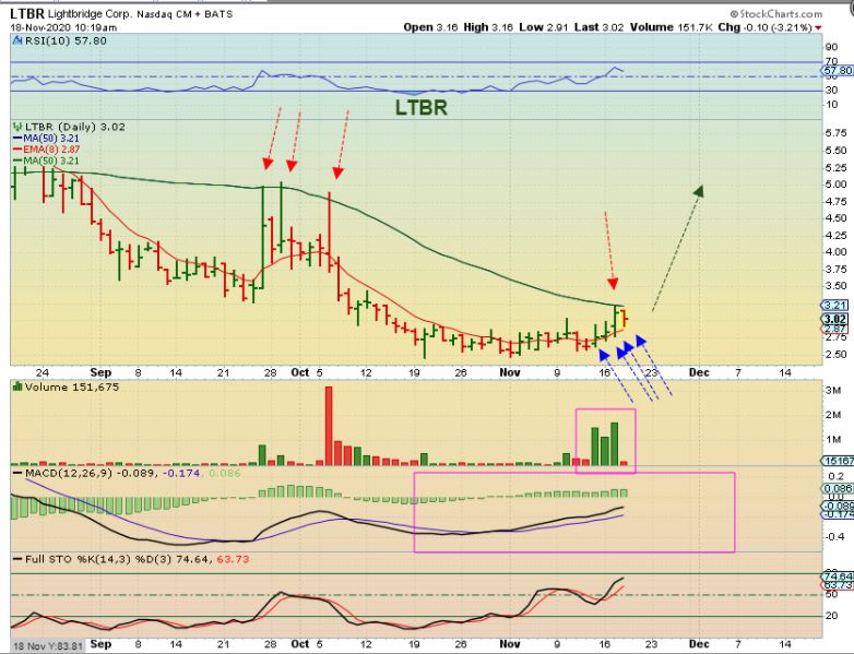 LTBR – I bought LTBR under the 50sma hoping for a break out in this hot sector. It was rejected and also dropped lower on Wednesday. Is it broken? Not yet. This is a round base and chops around the 8 ema or 10 sma. This pinch can still break out, but that is where this trade stands. It is a SQUEEZE PLAY. Pinched between the lows and the 50sma, we’ll see where this goes from here.