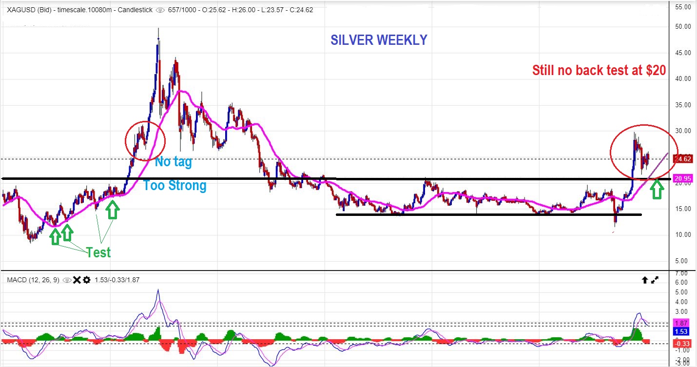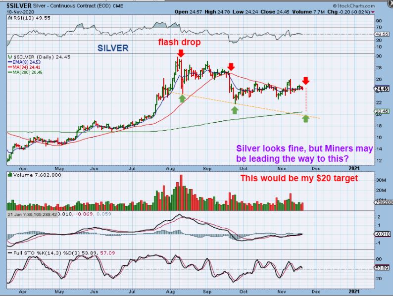 NO, THIS WEEKEND I MENTIONED THIS: SILVER dropping down would still form a normal a-b-c drop and it would tag the 30 week ma too. Silver also never got oversold. Basically Silver & Silver stocks have been looking stronger and I own a few Silver stocks, but this chart is not oversold.