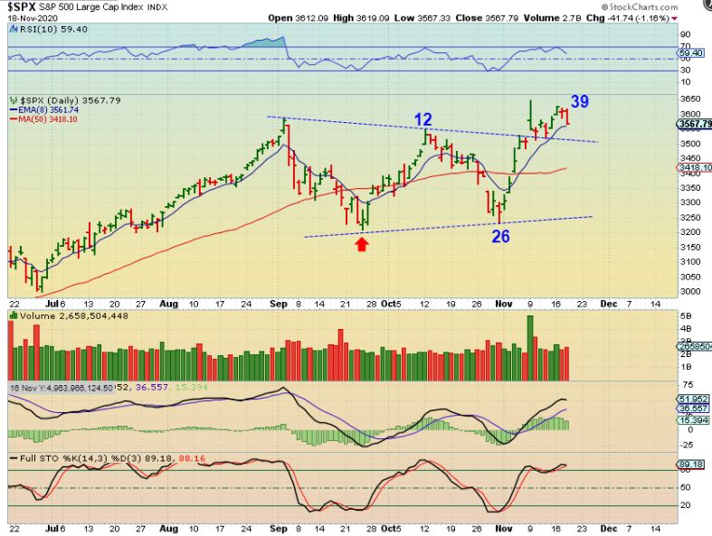 THE SPX landed on the 8 ema again, and normally that might be all we see in our climb higher, but we are also getting late in this daily cycle if this count is correct. That could lead to a deeper sell off, so watch the 10sma. We might actually back test the triangle. A back test of the 50sma is not out of the question either (People are very bullish right now and a pull back always comes along around now and dampens the party. The markets dropped QUICKLY in the last hour yesterday…