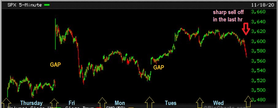 SPX 5 day 5 minute chart– This highlights that final hour sell down. I also see a gap further down, so we could see additional selling and it may be time for a dip into a dcl. The bad part is that many things sold off in that final hour along with the markets and they may all continue lower if the selling continues too.