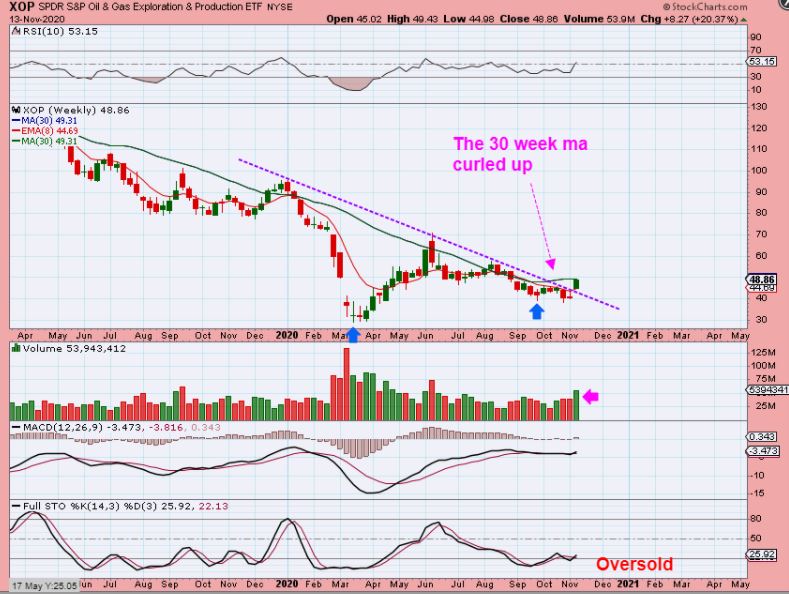 FROM THE WEEKEND REPORT: THE XOP gapped over that down trend line that I have been drawing, and it still remains quite oversold on a weekly basis. The 30 week MA is curling up. As noted, Oil stocks are setting up at the lows and I have mentioned examples like MRO, AROC, VLO, ERF, APA, LPI, CPE, , etc.