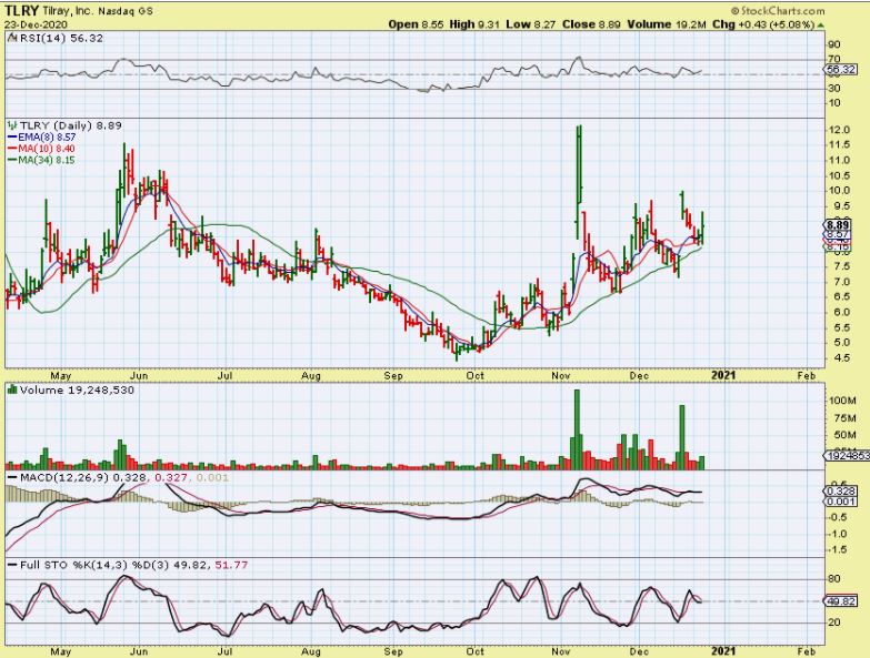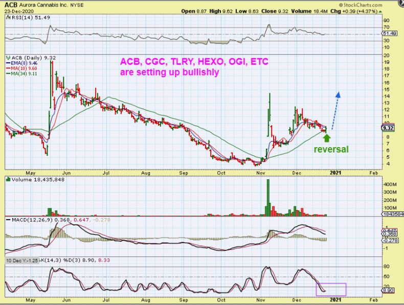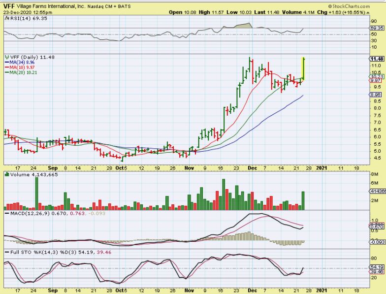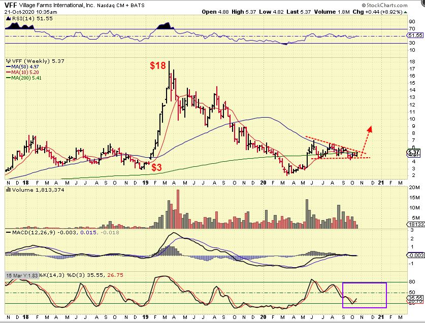 VFF was listed a s a BUY in my Oct 21 report with this Bullish pinch set up near $5 to $5.30. I also listed several others at that time, like OGI, TLRY, CGC, HEXO, IGC, etc – keep these on a watch list.