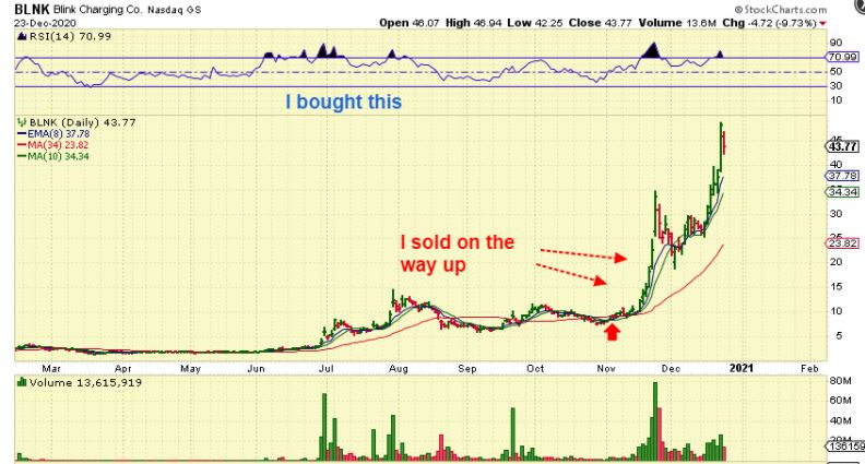 Let me also mention this: You can see that after I sold it peaked at $35 and dropped to $20. THAT IS A LOT and VERY HARD TO RIDE. So I am fine with my trade near 100% gains, but obviously this sector is on fire and BLNK is a rocket ship! ( P.S. It is too extended to buy here as low risk entry).