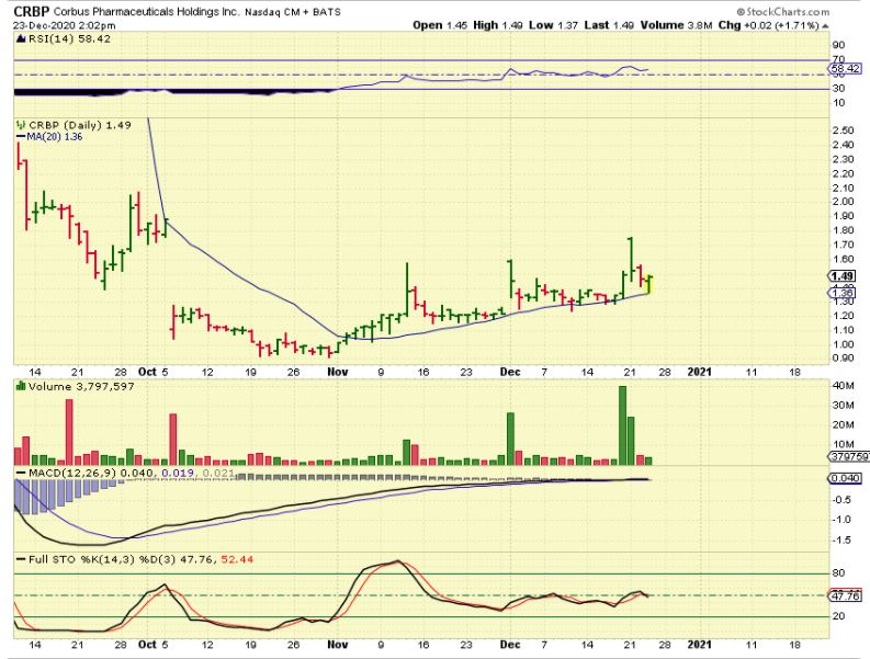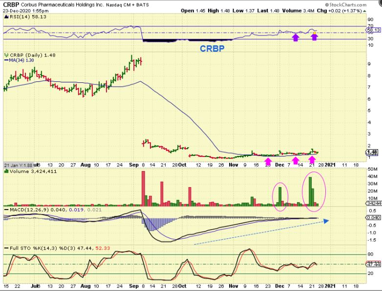 CRBP is one that I have owned for a little while and finally want to mention it , since the sector is heating up. I like that it is climbing the 20sma with bullish volume pops. I want to say that these Biotech stocks are also risky ( A failed FDA trial can send on down big time for example), but I have a position in CRBP because
