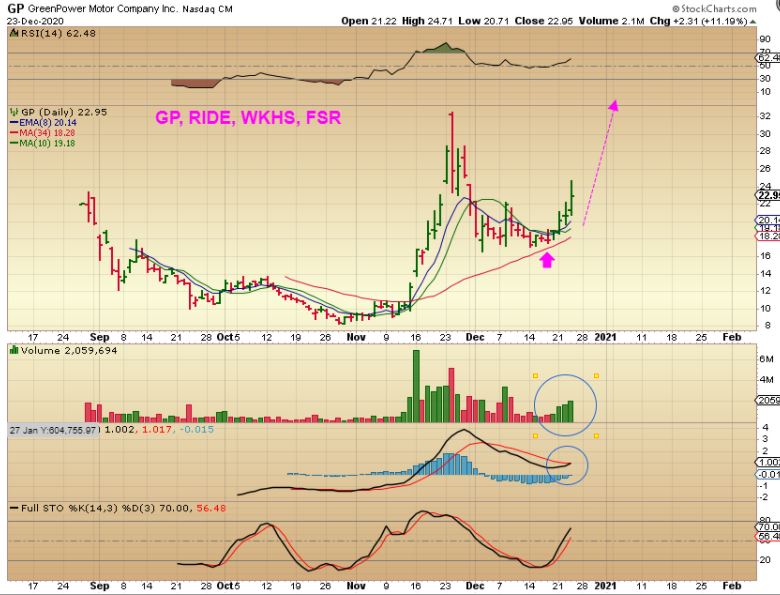GP , FSR, WKHS, and RIDE are Bullish set ups in that same EV sector. They all look very good and can be considered a BUY, however please know that they can pop 20% in a day, and drop 10% the next. This is very hard to ride if you are not ready for it, so these may nor be for everyone. That said, I think these can all break to new highs, similar to what we saw when trading BLNK. These are Buy Set ups. Let me show you something…