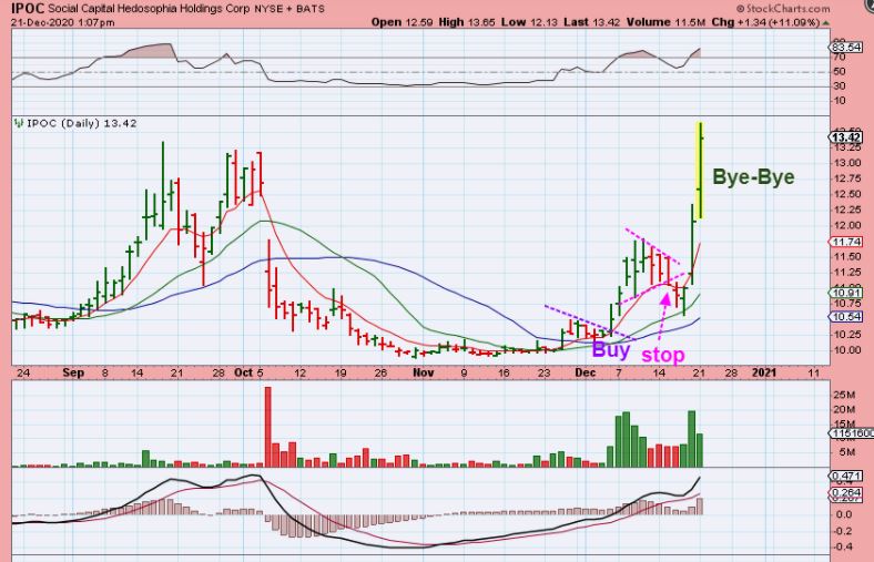 DEC 21 : IPOC dropped quickly and then exploded higher (this was Dec 21 at $13.42). It hit $15 yesterday. These set ups have been leading to very strong gains, but they are also Very Hard to buy & Hold, because the down days can be down 10% or more in a day, so I sell portions on the way higher. So…