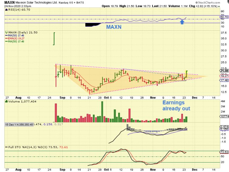 In November I bought and recommended MAXN as it was in this base. It broke out as shown here around $21 as a buy too.