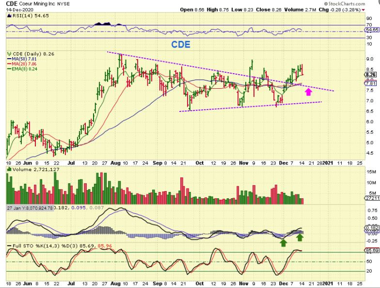 I also mentioned that I own CDE and CDE did pull back a little yesterday. So if you see Miners that remain bullish but may pull back a little during the selling, you can buy the dip at support with a stop. This may back test the triangle and the 50sma. If it does, I may want to add there if it reverses. Others may want to start a position?