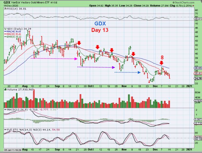 GDX – This is where our readers are getting fed up. Silver looked fine, Gold is a bit choppy, but Miners sold off on Monday on Day 13. A day 13 sell off with a day 8 peak is obviously discouraging, but is it the death sentence for Miners? No, and I will dig a bit deeper in this report to show you why I say that.
