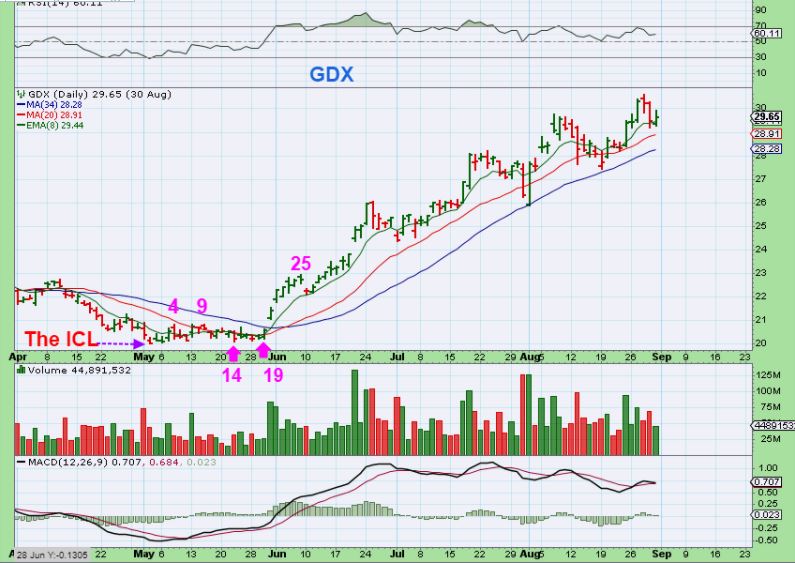 GDX ICL AT THAT TIME – GDX COULDN’T EVEN GET ABOVE THE 20 SMA HERE FOR ALMOST 20 DAYS! THEN IT TOOK OFF LIKE A ROCKET! Please look at this chart as the GDX chopped along at the lows for 19 days, and then look at the blast off higher. So this shows you that it IS possible for a first dily cycle to hold the lows and look very weak before pushing higher. Also…