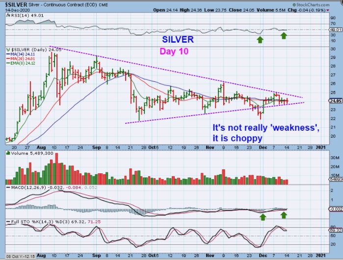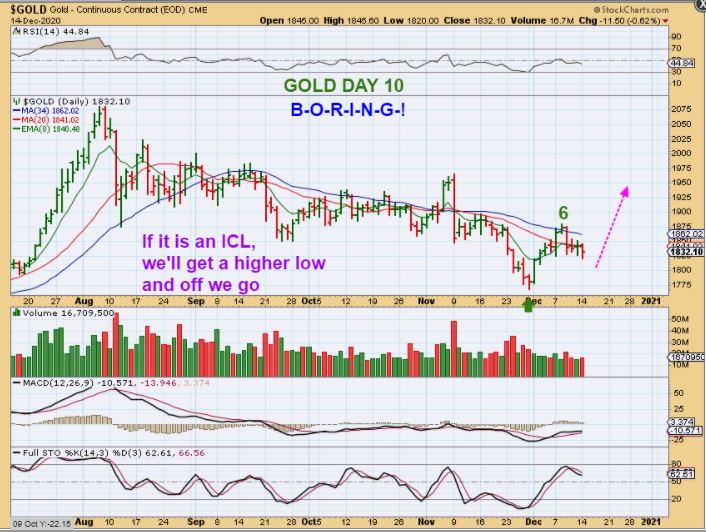 GOLD would be on day 10 and we are overdue for an ICL, so this is a November dcl and should be the ICL. The inability to break out above the 50sma & run is frustrating many and is causing many to feel that this looks too weak to be an ICL. I will address that shortly. For now we are going to look for a break above day 6 to add to our confidence that this is an ICL. The MACD is encouraging.