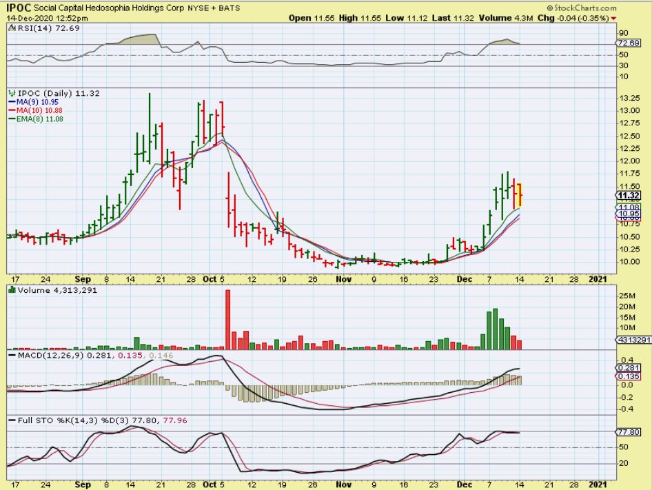 In the live area I mentioned IPOC & IPOB as a trade that I took a while ago and I am still in the trade. IPOC did not take off like IPOB yet, but it is finding support and bouncing off of the 8 ema so far. I am expecting a full cup to form or it may do what IPOB did (New highs). Even from here that would be $11 to $13+ or more. So far I see High volume up, light volume pull backs.