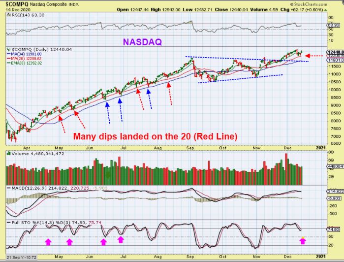 THE NASDAQ actually closed up after bouncing off of the 20sma area. The Tech Sector has been strong and dips can be minimal as seen on this chart all year long. If you went long on the ‘buy’ pointed out at that higher low in early November ( TQQQ or SOXL, ETC) you can add on the dips.