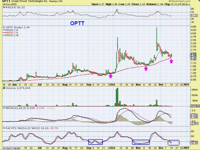OPTT is a low risk / high reward possibility entry here, since you can place a stop under the 50sma.