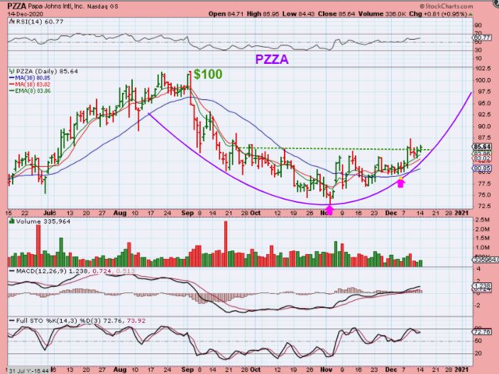 PZZA – This is possibly a covid proof company, as long as they deliver. Papa John’s looks to be breaking from a base and ready to move higher