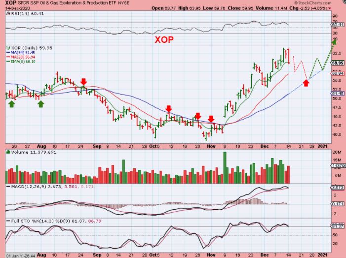 So you can see that even though OIL recovered, THE XOP closed at the 8 ema without a bounce. It is day 31, so I have drawn a possible path where a ‘deeper than the recent dips’ lands on the 20 sma or 34 sma & reverses. I’ll be looking for clues along the way to signal that the selling is drying up.