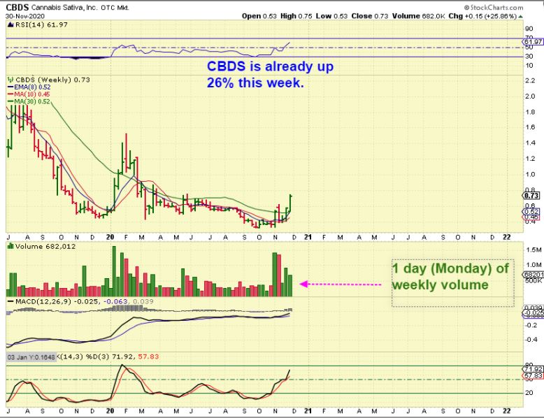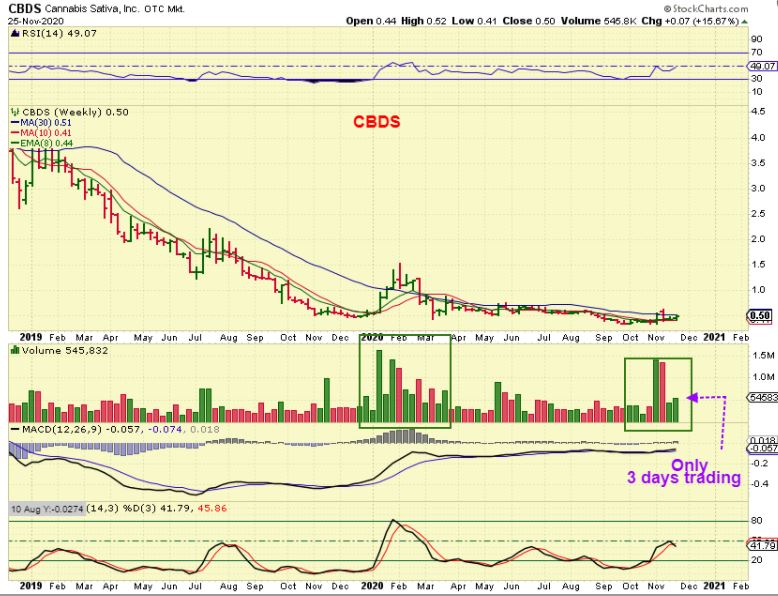 CBDS NOV 25: In Fridays report I posted A Daily and a Weekly chart of CBDS -This was a candidate to pop with this bullish set up. I mentioned that it was similar to MRMD, which popped over 100%.