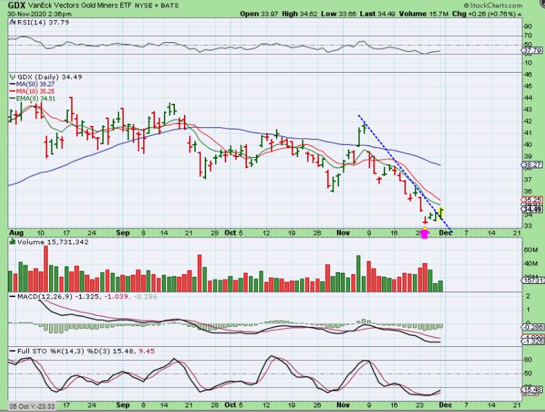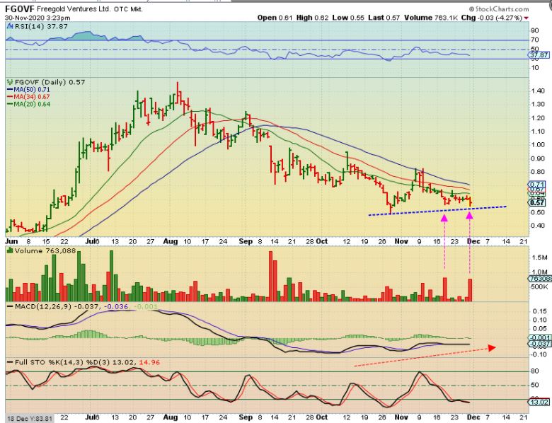 FGOVF – I was using this chart to show that as Gold sells off, I am seeing some higher volume days with reversals. This can indicate minimal selling due to accumulation. FREEGOLD VENTURES has not broken the Oct lows.