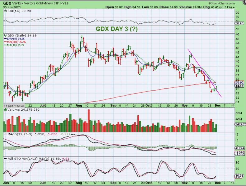 We do not have a ‘confirmed’ swing low in the Miners yet, but based on what I’m seeing I wouldn’t doubt that the lows are in place. I mentioned in the weekend report that it looked like Miners were holding up or possibly being accumulated as Gold sold off Friday, and then we saw it again Monday. Gold was down big Friday and Monday and Miners were green. I don’t like to ‘recommend’ buying until a confirmed swing low is in place, which includes GDX breaking above the 10sma & breaking a downtrend, but I personally would do a little buying under these circumstances. You can place a stop close by on the ones that are acting correctly.
