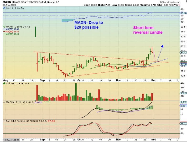 MAXN – I mentioned in the live area that I was selling a ‘good chunk’ of my MAXN after an excellent run. I bought this rather heavy after they released earnings and it dropped to the 50sma & reversed. It ran from under $18 to $27.25 in 4 days. I am in the habit of locking in gains if I see a reason too, and I will look to re-enter at $20 as shown if possible.