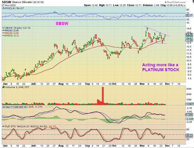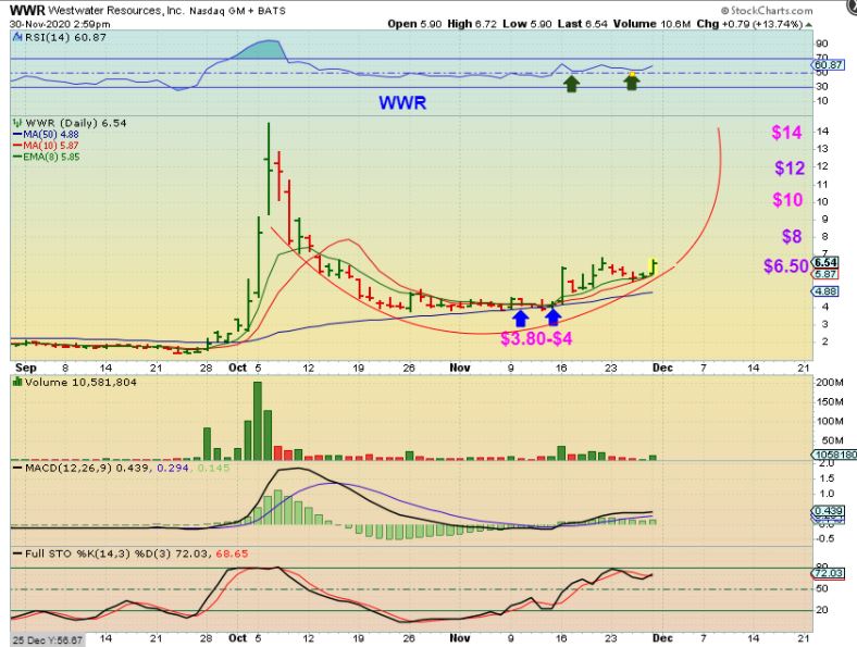 WWR – I have been pointing out WWR since the 50sma was at $3.80. It is still slowly making progress at $6.50 and has great upside potential. I still own it as it crawls along the 8 ema.