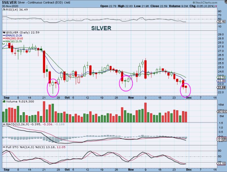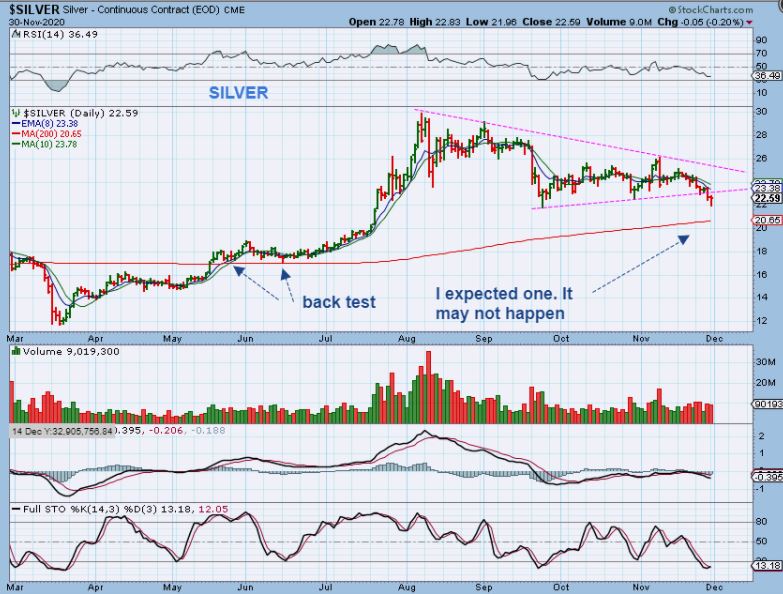 SILVER did not break the lows from September yet, but it broke down from what may have looked like a Bullish triangle. This may be a shake out too. I HATE that it didn’t drop to the 200sma or break September lows yet, because it leaves that feeling that that still should be expected. As we watch this, many Miners are starting to act bullishly making Miners a difficult set up to buy. Let me zoom in on Silver…