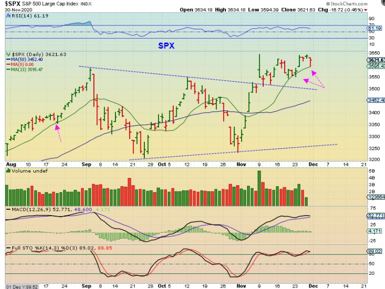 THE SPX ( and the NASDAQ) dropped down and then bounced right off of the 13 sma. That is what I said I would look for since we are long here. So far it remains bullish.