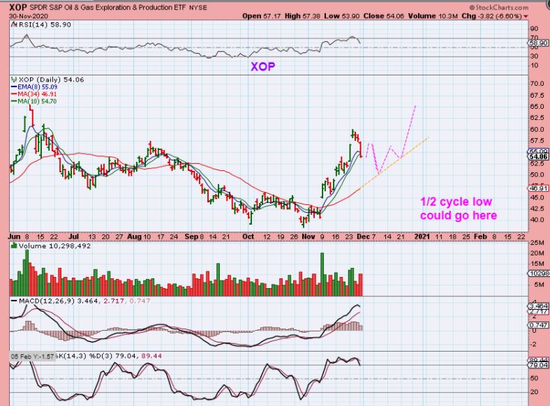 THE XOP had a quick drop Monday : The Drop in Oil stocks looks a bit exaggerated for a 1 day drop, so I am wondering if we might get a bit more than the quick reversal at the 10sma this time. We could get a 1/2 cycle low and that could dip a bit deeper than prior dips. I have drawn in a drop to the 34 sma as a visual, but I cannot tell for sure yet. I’m watching for a reversal. Lets look at a couple Oil Stocks.