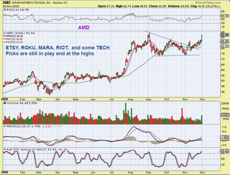 We also have plenty of other trades going on in all sectors, but I want to say that I am starting to close up EV trades. As I look at the pull backs in SOLO, BLNK, and a few others, I feel that they now may be ready for a more prolonged consolidation. We’ll see, but Biotech, MJ Stocks, Blockchain, and some of our Tech or Covid-proof general market trades like AMD, MU, TSEM, ETSY, ROKU, GME, and more are still looking strong.